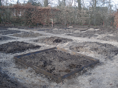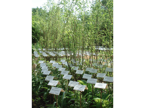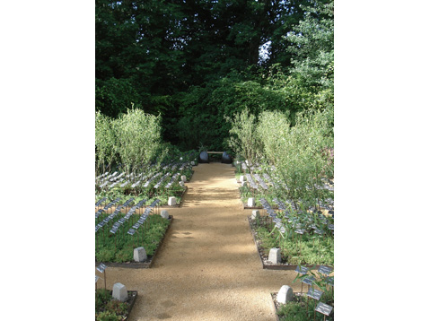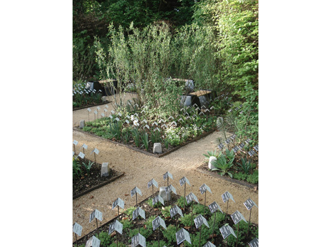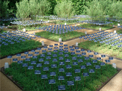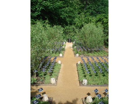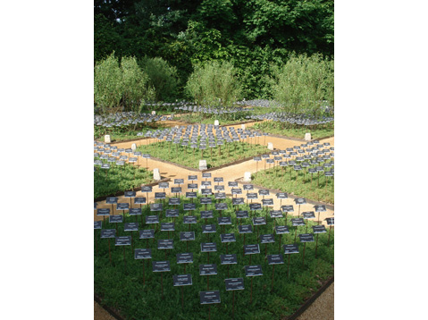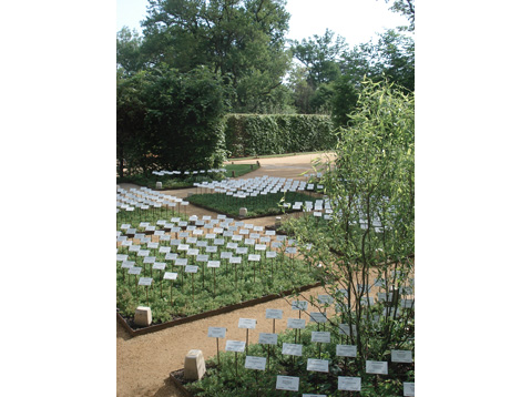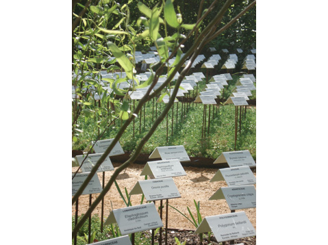 Sur le pourtour du jardin, les carrés d’étiquettes évoquant les espèces disparues sont recouverts par d’épais massifs d’arbustes, qui semblent vouloir recoloniser la surface ordonnée du sol.